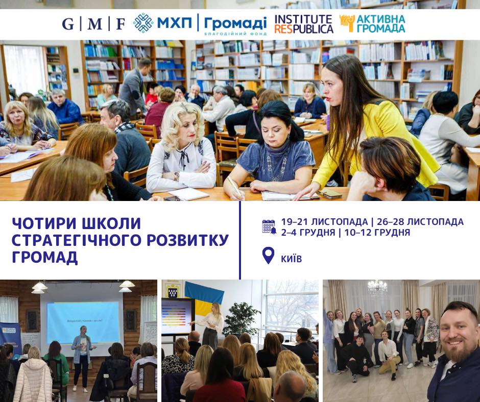 Інститут “Республіка” у партнерстві з Благодійним фондом “МХП-Громаді” за підтримки German Marshall Fund запрошує представників органів місцевого самоврядування, бізнесу та громадського сектору взяти участь у Школах стратегічного розвитку громад, спрямованих на посилення спроможності місцевих лідерів до стратегування в умовах війни та процесу євроінтеграції.