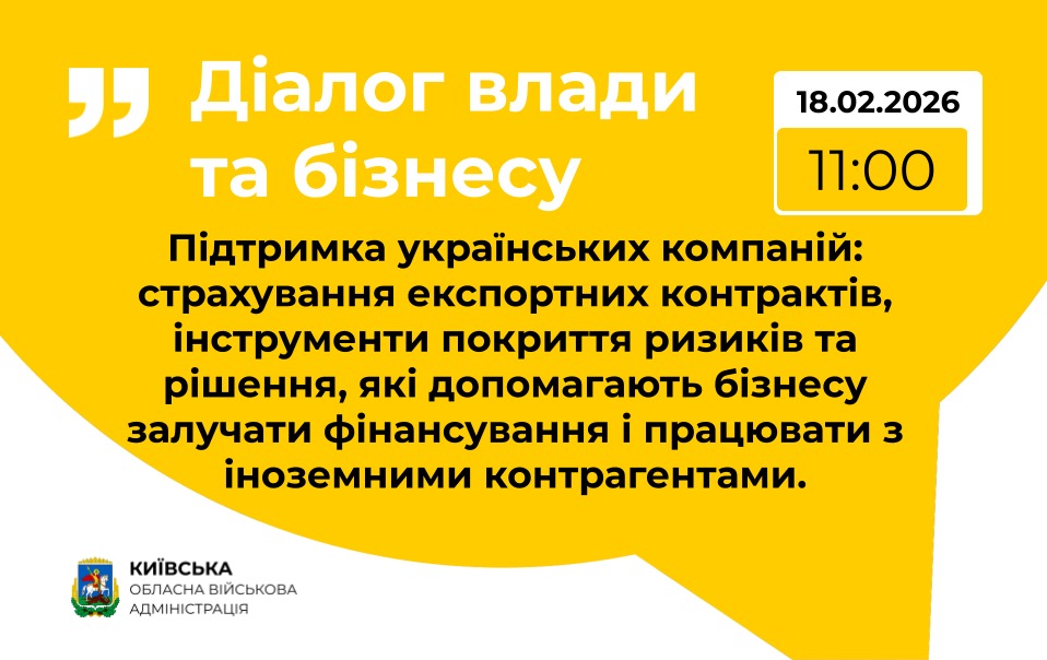 У межах платформи «Діалог влади та бізнесу» 18 лютого 2026 року об 11:00 відбудеться онлайн-зустріч на тему «Підтримка українських компаній: страхування експортних контрактів, інструменти покриття ризиків та рішення для залучення фінансування».
